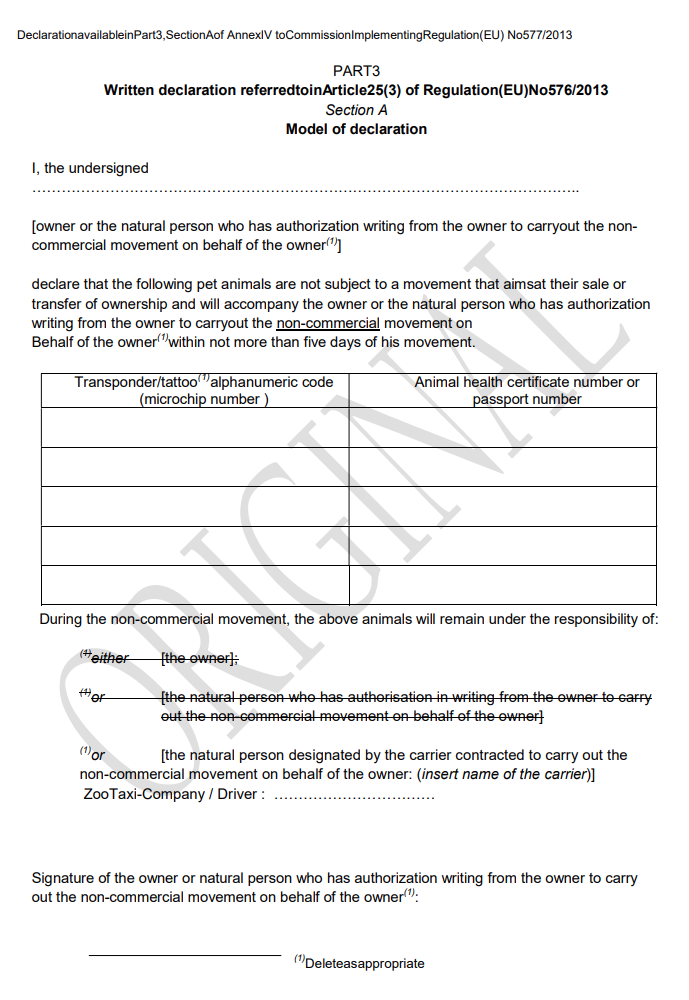 Trebuie să completați o declarație dacă nu intenționați să vindeți sau să transferați proprietatea animalului dvs. de companie. (aceasta se regăsește in certificatul eliberat de VET)