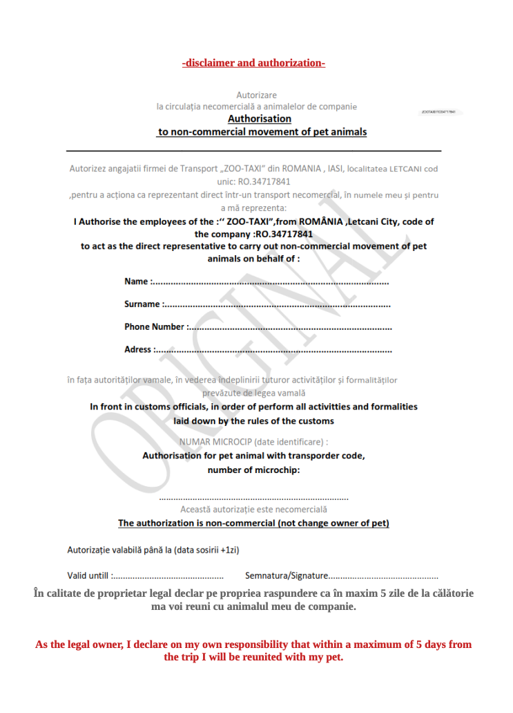 Trebuie să utilizați un transportator aprobat DEFRA (ZooTaxi SRL) si sa dați un acord de autorizare. (aceasta se regăsește in certificatul eliberat de VET)